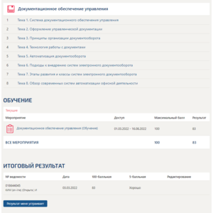 | Описание: | 73 вопроса с ответами (полный перечень на момент сдачи теста). Итоговая оценка 83/100 баллов |