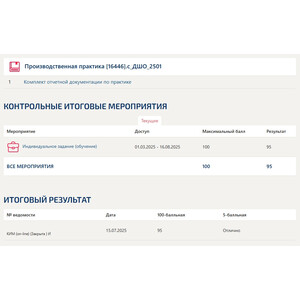 | Описание: | Направление подготовки: 44.02.01 Дошкольное образование. Результат: 95 баллов. Место прохождения практики: МДОУ. |